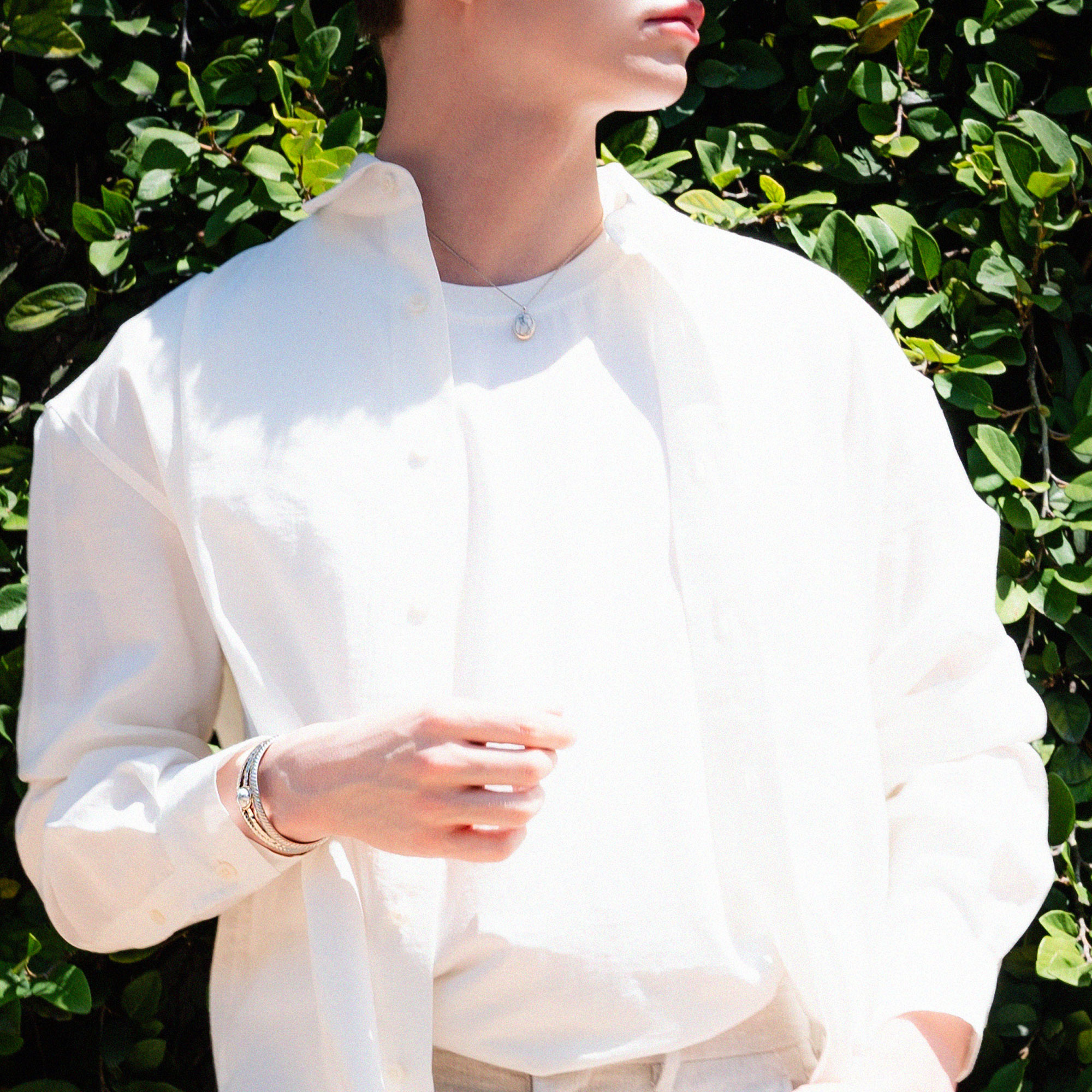 品格を醸し出すジュエリー。ペンダントは凛とした印象でジェンダーフリーを極めた洗練度の高さ。